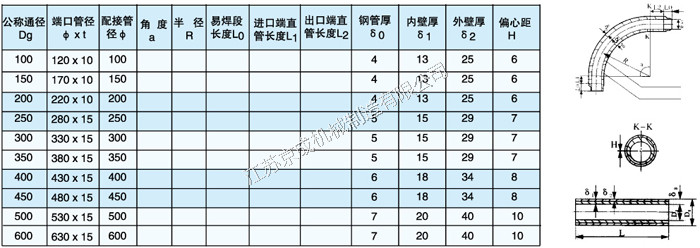 弯管尺寸及规格 ( 表中a、R、L0、L1、L2依设计要求确定 )