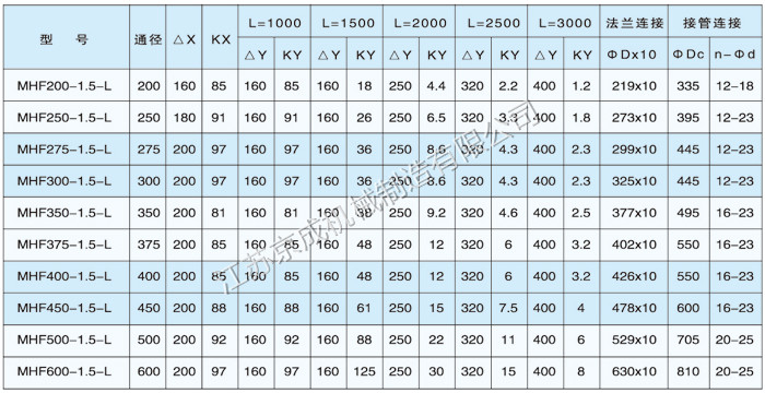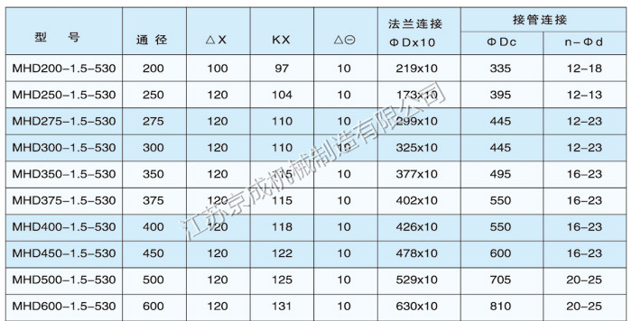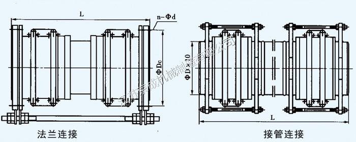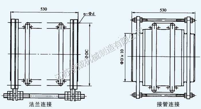 2、表中符号代表和技术参数:△X:轴向补偿量(mm); △θ:角向补偿量(度); △Y:横向补偿量(mm);KX:轴向刚度(N/mm); Ky:横向刚度(N/mm); L:产品总长(mm);ΦDx10:接管外径x接管厚度(表中mm),产品为接管连接;ΦDc:连接孔分布的中心圆直径; n-Φd:n为连接孔数,Φd为连接孔径,产品为法兰连接;