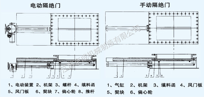 隔绝门与关闭挡板风门一样在锅炉烟风系统中作截流之用。热(冷)风隔绝门是装在火力发电厂锅炉空气预热器出口到磨煤机进口管道上的关断门。热风隔绝门是 在广泛吸收国内外先进技术的基础上研制而成的新一代产品,是锅炉的关键辅助设备。该产品采用单气缸或电动方式直接推动风门板由偏心轮楔式夹紧,具有结构简 单、安装操作维修方便、关闭严密、磨损补偿的突出优点,机架采用铸铁件,密封面为镶铜材料,具有抗高温、变形小、寿命长的特点。